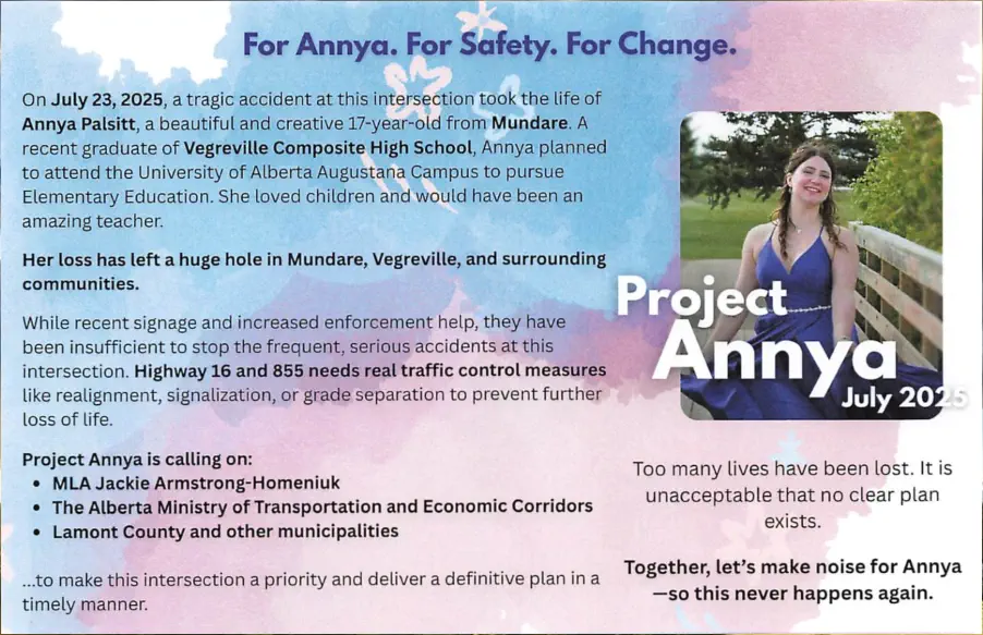 On July 23, 2025, a tragic vehicle accident took the life of Annya Palsitt – a beautiful and creative 17 year old from Mundare AB. A recent graduate of Vegreville Composite High School, Annya had plans to attend the University of Alberta Augustana Campus pursuing Elementary Education in the fall. She loved children and would have made an amazing teacher. Her Loss has left a huge hole in Mundare, Vegreville and surrounding communities. While recently installed signage and increased enforcement are a step in the right direction, they have been insufficient to prevent the frequency and gravity of incidents at this intersection. The intersection of Highway 16 and 855 requires physical traffic control measures such as realignment, signalization or grade separation to prevent further loss of life and injury. Project Annya is calling on: MLA Jackie Armstrong-Homeniuk The Alberta Ministry of Transportation & Economic Corridors Lamont County & other municipalities … to make this intersection a priority and to deliver a definitive plan in a timely manner to bring an end to the many accidents and loss of life occurring year after year.